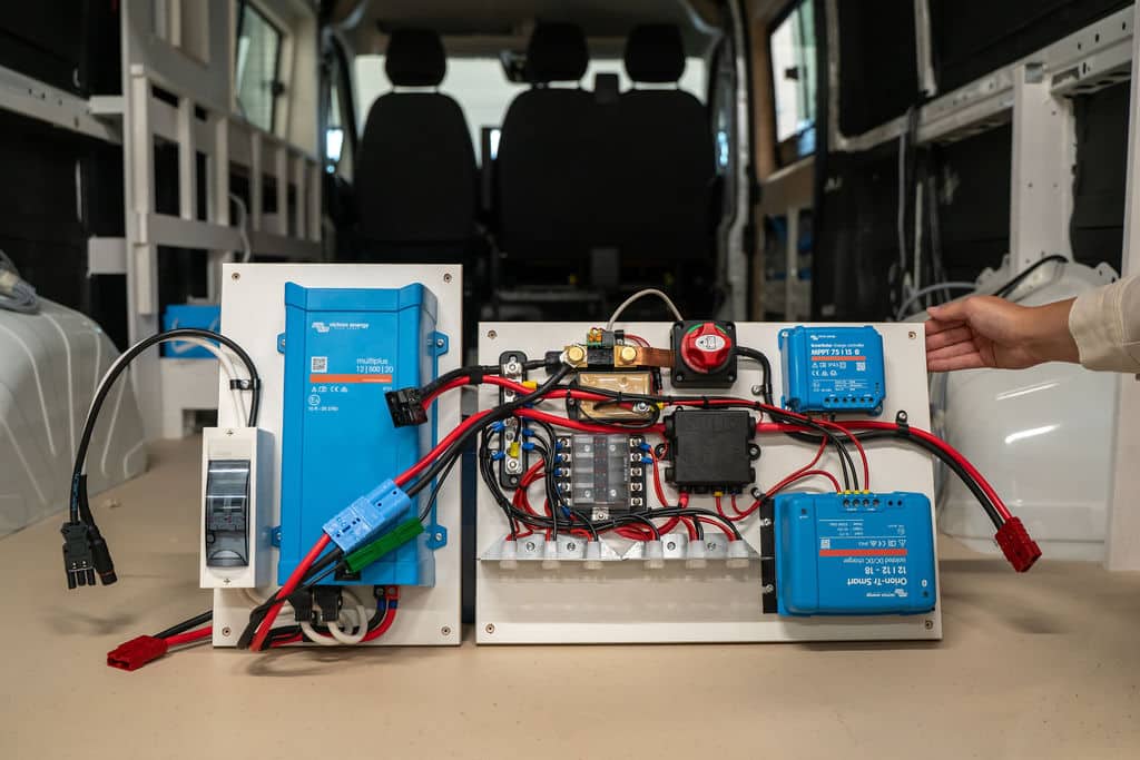 De eventuele zonnepanelen, walstroomaansluiting en de installatie om tijdens het rijden je accu op te laden plaatst de technicus in je bus. Ook deze aansluitingen zijn voorzien van een stekker en sluit je makkelijk aan op het powerboard.