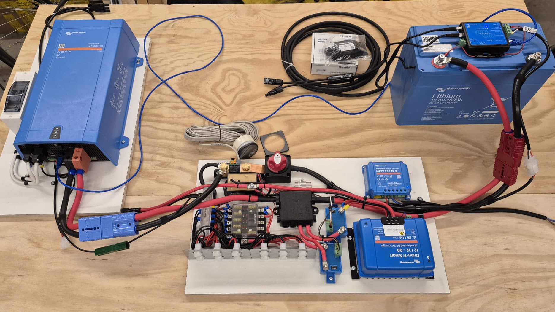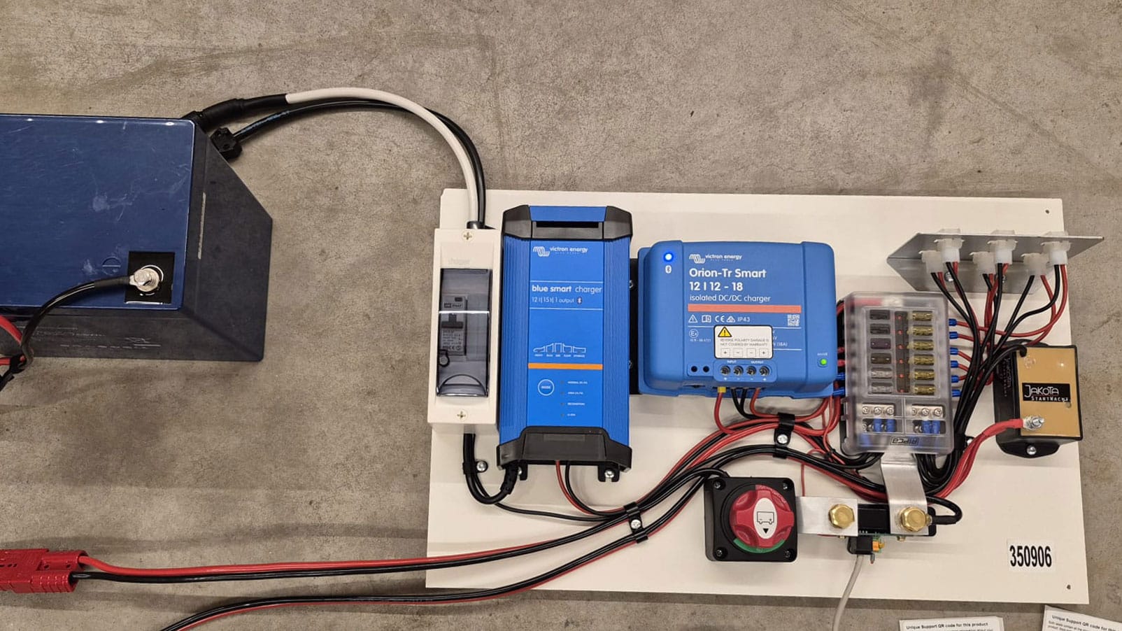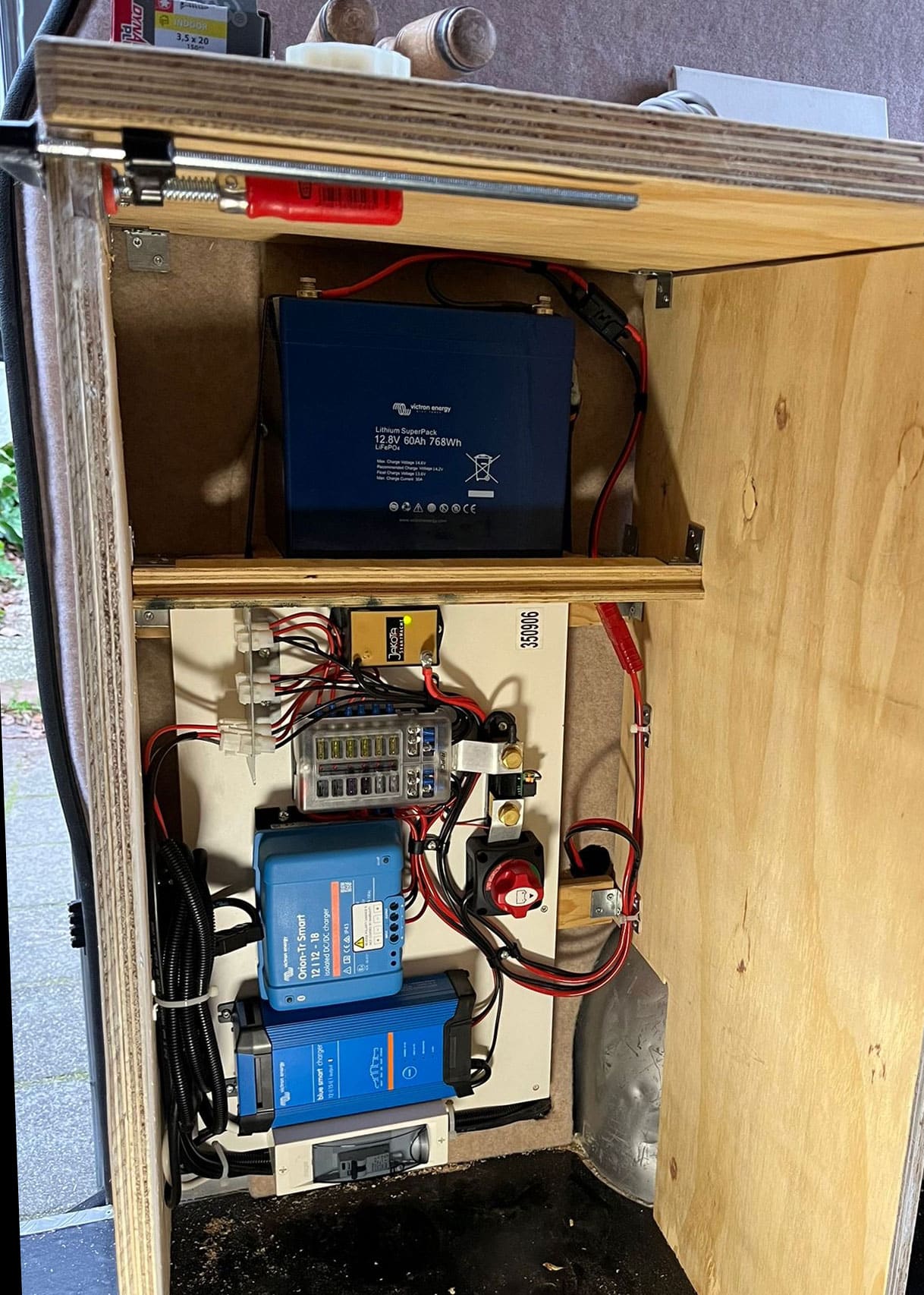 Compact: Victron Lithium Accu SuperPack 12,8V/60Ah, Victron Blue Smart IP22 Acculader 12/15(1), Victron Orion-Tr Smart 12/12-18A (220W) geïsoleerd, StartWacht, Victron Batterij Monitor BMV-700, Aardlekautomaat, Mini defa walstroomaansluiting, Zekeringhouder voor de elektrische componenten, 12V steekzekeringhouders.